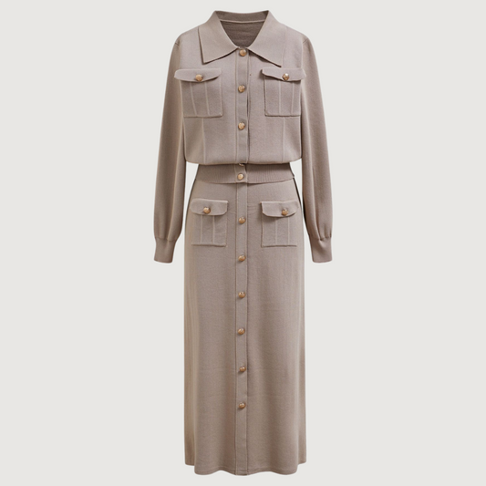 Elegant knitted maxi dress with button placket and eyelet pattern