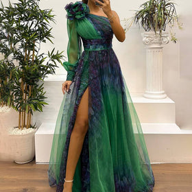 This long dress features a unique floral pattern. Its one-shoulder design and side slit add a touch of elegance.