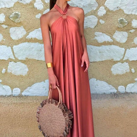 This long dress offers a fluid and elegant cut. Its sleeveless design and V-neck highlight the silhouette. Perfect for summer evenings or special events.