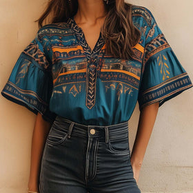 Discover the perfect combination of style and comfort with this trendy teal V-neck blouse. The playful, unique print gives your outfit a fresh and fashionable look. The flattering fit and airy fabric ensure a comfortable wearing experience, ideal for everyday wear as well as special occasions.