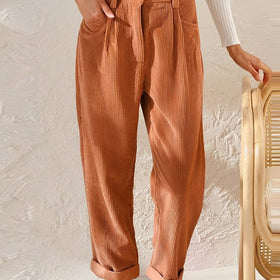 These elegant corduroy pants for women are characterized by their classic style and high waist. The ankle-length fit creates a modern silhouette that ensures a stylish appearance both in everyday life and at the office. Pair them with various tops for versatile looks.