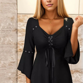 Imagine walking into a room and all eyes turn to you. This black top with delicate lacing and flared 3/4 sleeves creates a feminine and seductive silhouette. The slightly stretchy materials ensure a perfect fit and maximum comfort.