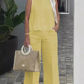 Discover the perfect summer outfit with our breathable linen set, consisting of a sleeveless top and wide pants. Ideal for relaxed days, this set offers both style and comfort.