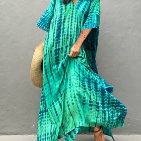With our women's V-neck caftan dress featuring a bohemian batik pattern, you are effortlessly stylish. This airy caftan offers a relaxed silhouette, a flattering V-neckline, and a vibrant tie-dye pattern, perfect for casual outings and warm-weather adventures. Experience ultimate comfort and boho flair in this long maxi dress.