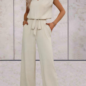 Camilla | elegant sleeveless blouse set with lace neckline and pants