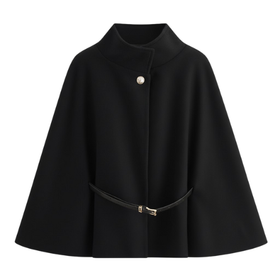 This Cape Poncho is the ultimate expression of sophisticated fashion for the elegant woman. Designed with a striking batwing sleeve silhouette, this cape coat offers a sleek and flowing cut reminiscent of classic black capes. The included belt accentuates the waist, providing a defined and fitted silhouette to the poncho's voluminous design. This versatile piece is perfect for adding a touch of dramatic style and essential warmth to your winter outfits.