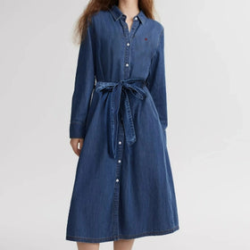 The Carina shirt dress combines classic elegance with a modern flair. Featuring a full button closure and a tailored cut, it accentuates the feminine silhouette. This dress is perfect for the office, everyday wear, or stylish casual looks. The soft denim fabric ensures high comfort and a pleasant fit, while the tie belt allows for individual adjustment and subtly emphasizes the waist. The Carina shirt dress is a versatile highlight for every season.