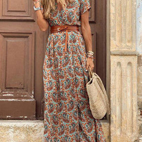 This long bohemian dress features delicate floral patterns and a flowing cut. Its V-neck and short sleeves provide a feminine and comfortable look. Perfect for sunny days, it combines style and ease.