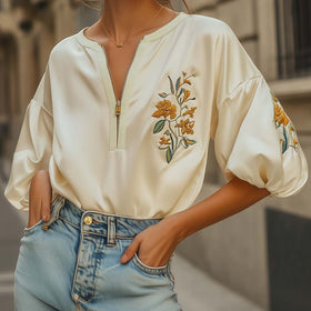 This stylish blouse combines a modern zipper with refined embroidery and adds a touch of class to your wardrobe. The subtle shine and elegant finish make it the perfect choice for various occasions. The detailed embroidery provides a feminine and stylish appearance, while the airy fit offers optimal wearing comfort.