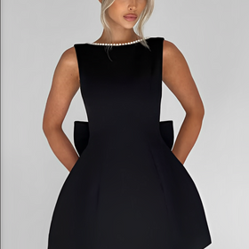 This sleeveless dress captivates with its refined knot at the back and delicate pearl details that add a touch of elegance. Its fluid cut and lightweight fabric make it a perfect outfit for special occasions and evenings. Available in several colors, it adapts to all style desires.<\/p>