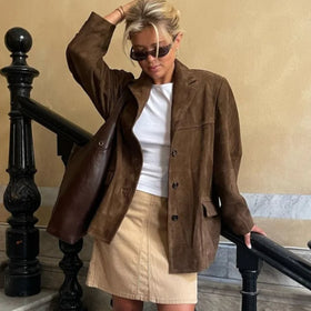 Step into autumn with confidence in our stylish brown suede coat for women. This chic top is perfect for the modern office woman and ideal for commuting or a casual outing. It provides warmth and comfort during autumn days and is a must-have in any wardrobe.