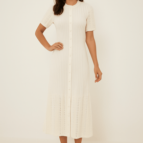 Elegant knitted maxi dress with button placket and eyelet pattern