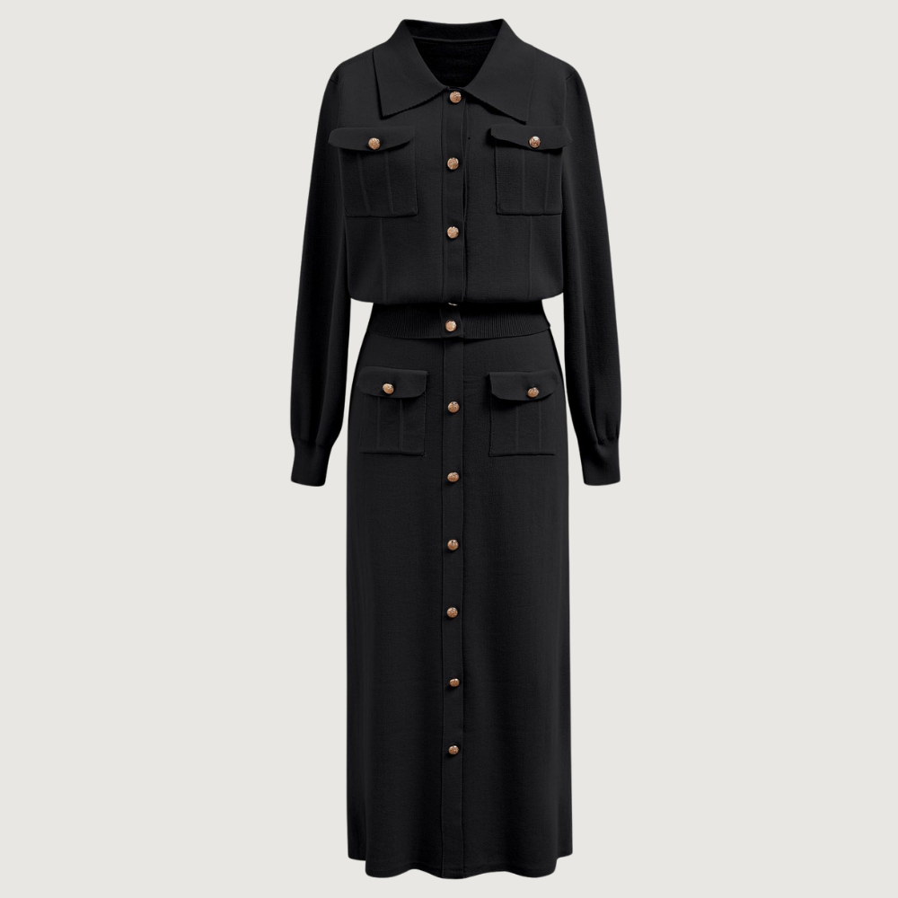 The elegant knit two-piece set offers timeless style and excellent comfort. This matching blazer and skirt set is made of soft knit fabric and features chic button details, ideal for a polished look in any season.