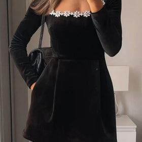 This stylish mini dress combines timeless elegance with a playful touch. The straight-cut skirt and long sleeves create a classic silhouette, while the square neckline with delicate floral embellishments is a real eye-catcher.