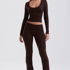 This elegant two-piece set in hot chocolate color combines comfort and style. With a classic top and matching pants made from a soft blend, it offers the perfect solution for relaxed days.
