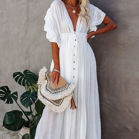 This long dress perfectly embodies the bohemian spirit with its delicate V-neckline and short flared sleeves. Its loose cut and length create an elegant, flowing, and airy silhouette, ideal for sunny days or casual occasions.