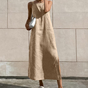 This long dress captivates with its minimalist style and fluid drape that naturally enhances the silhouette. Its clean cut and discreet side slits make it a perfect piece to combine comfort and refinement. Light and pleasant to wear, it adapts well to sunny days as well as moments of relaxation on vacation.