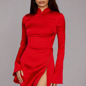 This red mini dress combines elegance and strength in a slim silhouette with subtle shine. The high neckline and tight fit create a confident look, while the long sleeves give the dress a refined and timeless touch.