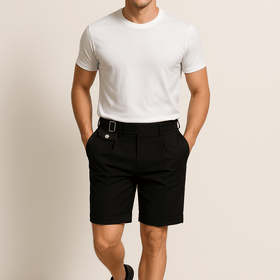 The Ezra Shorts combine classic elegance with summer lightness, offering a perfect choice for stylish summer outfits. With adjustable waistband closures and front pleats, they provide a structured silhouette and high wearing comfort.