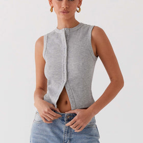 Discover our sleeveless top in gray melange, featuring a stylish button placket. This top combines elegance and versatility, perfect for women who want to add a touch of sophistication to their everyday looks.