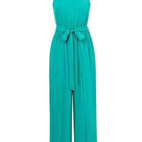 This sleeveless jumpsuit with halter neck and tie belt combines stylish elegance and high comfort. The simple design highlights the shoulders and creates an appealing look that is suitable for both everyday wear and special occasions.