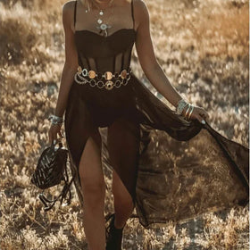 This stunning sheer long dress, inspired by festivals, is the centerpiece of a chic and bold bohemian look. Featuring a structured bustier-style bodice, adjustable spaghetti straps, and a flowing semi-transparent long skirt, this dress effortlessly combines a bold and airy aesthetic.