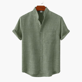 This Green short-sleeve shirt combines laid-back comfort with contemporary detail. Crafted in a lightweight, linen-look fabric, it features a mandarin collar and button-down front for a modern twist on a warm-weather classic. The soft green tone and relaxed cut make it easy to dress up or down, whether paired with shorts or tailored trousers.