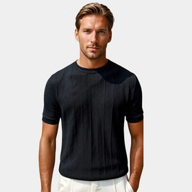 Step into timeless refinement with this black knitted short-sleeve shirt – a sophisticated essential for the modern wardrobe. Featuring a tailored fit with subtle vertical texture, it’s crafted from a breathable, stretch-enhanced knit that combines comfort with structure. Whether paired with linen trousers for a summer evening or dressed down with chinos, this versatile piece radiates understated elegance.