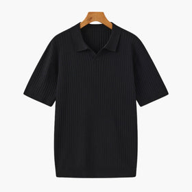 This Black ribbed knit polo delivers understated elegance with a relaxed yet tailored silhouette. Crafted from soft, breathable fabric with vertical ribbing, it offers subtle texture and stretch for all-day comfort. The open collar adds a refined touch, making this piece ideal for both smart summer events and elevated casual wear.