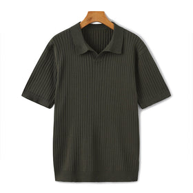 This Green ribbed knit polo delivers understated elegance with a relaxed yet tailored silhouette. Crafted from soft, breathable fabric with vertical ribbing, it offers subtle texture and stretch for all-day comfort. The open collar adds a refined touch, making this piece ideal for both smart summer events and elevated casual wear.
