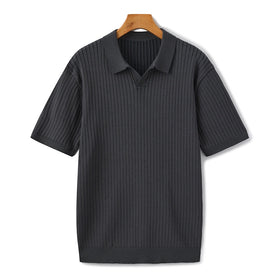 This Grey ribbed knit polo delivers understated elegance with a relaxed yet tailored silhouette. Crafted from soft, breathable fabric with vertical ribbing, it offers subtle texture and stretch for all-day comfort. The open collar adds a refined touch, making this piece ideal for both smart summer events and elevated casual wear.