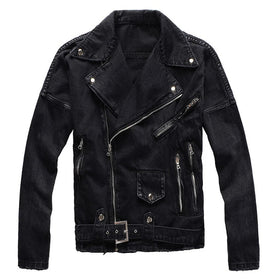 This black biker jacket for men combines style and functionality. Made from thick denim, it offers a slim fit and is ideal for streetwear looks.