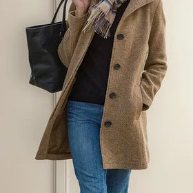 This mid-length winter coat, made from a soft wool blend, combines classic style with comfort. The button fastening, lapels, and subtle waistline accentuate the feminine silhouette, while the pockets add practicality. Perfect for everyday city wear and layering during the winter months.