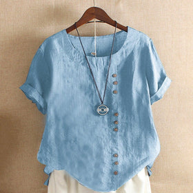 Step into effortless style with this charming tunic blouse. Featuring an eye-catching angled button design and a relaxed silhouette, it's the perfect mix of casual and chic. Whether you're out for the day or unwinding at home, this piece brings easy elegance to any outfit.