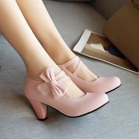 - Plain toe front: The closed toe provides a simple outline that contrasts with the decorative details on the straps and bow, allowing the pumps to be worn in both casual and more dressed-up contexts.