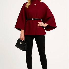Redefine your outerwear with this high-neck cape coat designed for bold elegance. Its dramatic drape, belted waist, and structured collar bring together comfort and couture, making it a statement piece for both daytime outings and evening occasions.