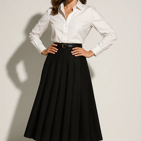 This pleated A-line midi skirt offers graceful movement and adaptable style for any setting. Designed to flatter the waist and flare subtly toward the hem, it suits both structured and relaxed dressing. A seasonal staple that transitions effortlessly from daywear to soft evening looks.