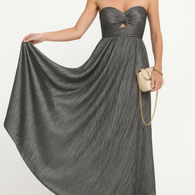 The twisted bodice adds depth to the neckline, while a subtle front cutout introduces a refined focal point. A fitted waist flows into a pleated skirt that glides with movement, combining sculptural elements with fluid design.