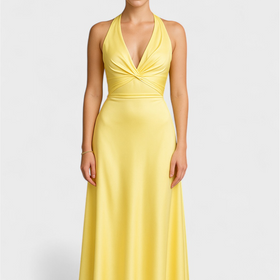 This maxi dress features a halter neckline with a twist-front detail at the bodice. The fabric has a soft finish and drapes smoothly over the body. The skirt flows from the waist, allowing for ease of movement and extended length suited for formal or evening settings.