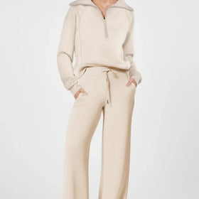 Embrace comfort and poise in this lounge set that combines a zip-front top with wide-leg trousers for a harmonious silhouette. The fabric flows seamlessly with your movement while delivering a clean, coordinated look you’ll reach for again and again. Ideal for relaxing at home, casual outings, or travel.