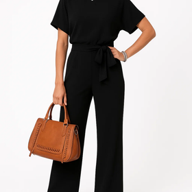 Embrace effortless sophistication with this belted jumpsuit, designed to transition seamlessly from daytime engagements to evening events. Its tailored silhouette and thoughtful details offer a polished look suitable for various occasions.