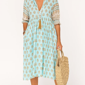 This dress showcases a deep V neckline that frames the upper body, complemented by a gathered waistline that lets the fabric cascade into a full maxi skirt. Subtle detailing at the sleeves and neckline enhances its boho aesthetic, making it a statement piece that is as effortless as it appears.