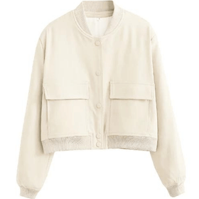 This women's bomber jacket combines a short cut with a front button placket and practical pocket design. Its casual yet structured look makes it ideal for layering over various outfits.