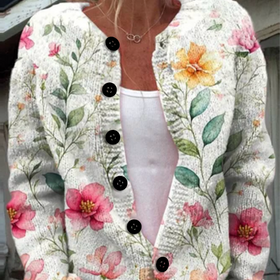 This cardigan features a button front opening, long sleeves, and a straight cut. The floral pattern adds texture and a decorative touch. Ribbed trims help maintain the shape of the entire outfit.