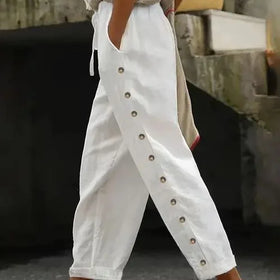 Women's casual pants with buttons combine comfort and style in a loose fit. Thanks to the loose fit, elastic waistband, and decorative buttons along the pant legs, they are ideal for relaxed days or weekend outfits.