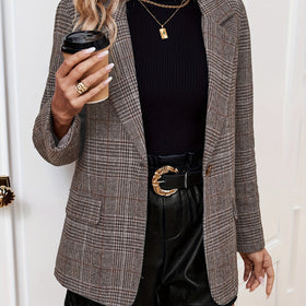 This women's blazer features a textured silhouette and a checked pattern, combined with long sleeves for a classic look. It is designed with a tailored fit and front pockets, suitable for formal and casual occasions.