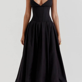 This midi dress combines a classic silhouette with a structured bodice and flowing skirt. The strapless cut brings together clean lines and sophistication – perfect for formal occasions with a stylish touch.