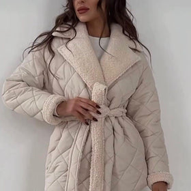 This elegant women's down jacket combines feminine chic with optimal warmth for cold days. The soft notched collar in teddy look and the tie belt create a flattering silhouette and make the jacket a versatile companion for various occasions.