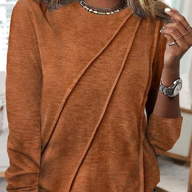This top features a draped front and long sleeves designed for a relaxed and comfortable fit. The round neckline complements the gentle folds and offers subtle texture without overwhelming the overall look. Suitable for everyday casual wear or layering.