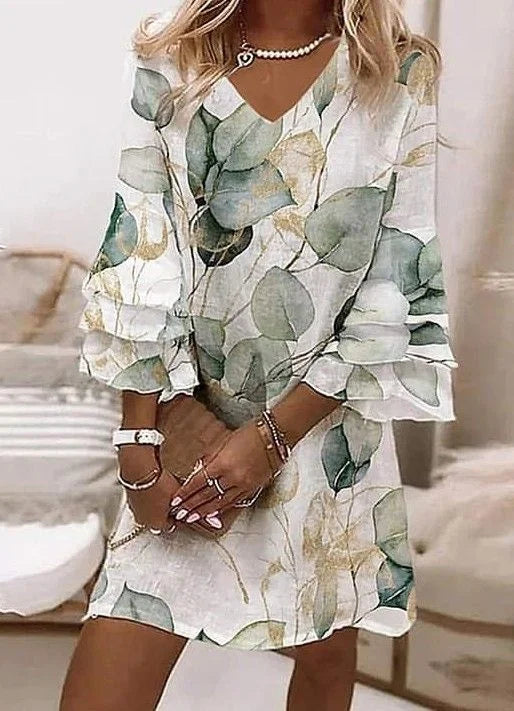This mini women's dress features a bold allover print, a V-neckline, and slightly flared sleeves. The above-the-knee cut provides an airy, casual feel, ideal for warm days or informal occasions. Its loose shape makes it perfect for seaside walks or everyday wear.